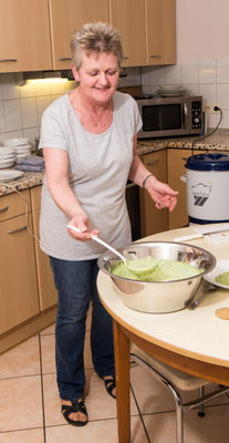 Mit vereinten Kräften durch Tochter Michaela. deren Papa Karlheinz und Heidi Hubert wurde unter Anleitung dann doch die perfekte Grüne Soße zubereitet.